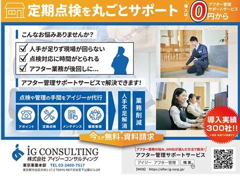 アイジーコンサルティング(東京事業本部、東京都渋谷区)は、引渡し後の戸建て住宅定期点検代行サービス「アフター管理サポートサービス」を提供する。