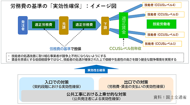 一方、出口段階の対策では、注文者が受注者に対して労務費の基準を踏まえた労務の支払いを実施。CCUSの活用などにより技能者の知識・技能・その他の能力を公正に評価し、適正な賃金を支払う。
