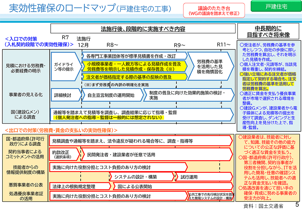 戸建住宅の工事では、発注者が個人であるケースが多いほか、短工期である、小規模事業者や一人親方が書面による契約を交わさない、といった特性もある。そこで個人の注文者や一人親方などに向けたガイドラインを作成して基準の反映に努め、適正な見積りを商慣習化する。