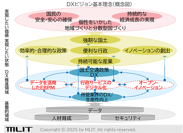 国土交通省は6月13日、国土交通分野のDX施策の方向性を示した「国土交通省DXビジョン」を策定した。「データ」「人材」「セキュリティ」―の3つの基盤的領域を強化し、国民の安全・安心の確保、持続的な経済成長、個性を生かした地域づくりなどの実現を目指す。