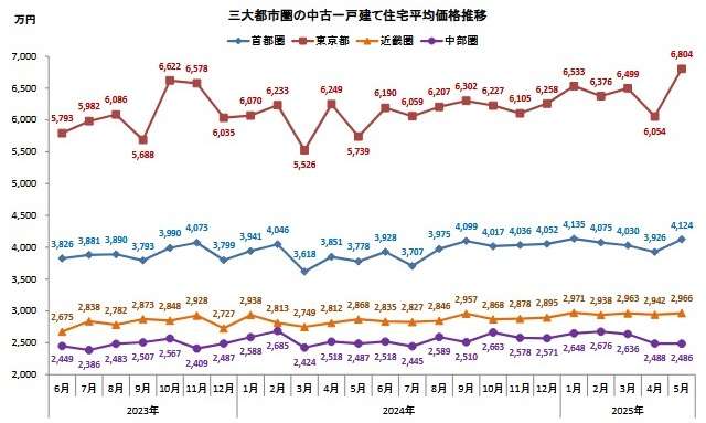 首都圏の中古一戸建ての平均価格は、前月比5.0%増の4124万円と4カ月ぶりに上昇。前年同月比は平均築年が同程度ながら9.2%増となった。東京都は6804万円(12.4%増)と大きく上昇し、2014年4月の集計開始以降最高価格を更新した。