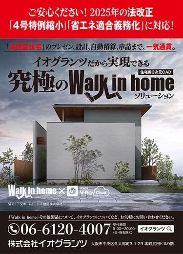 業界最速レベルという住宅用3次元CAD「Walk in home」を展開するイオグランツ(大阪市)は、高性能住宅のプレゼン・積算・設計・申請の全工程で大活躍する同CADを提供する。