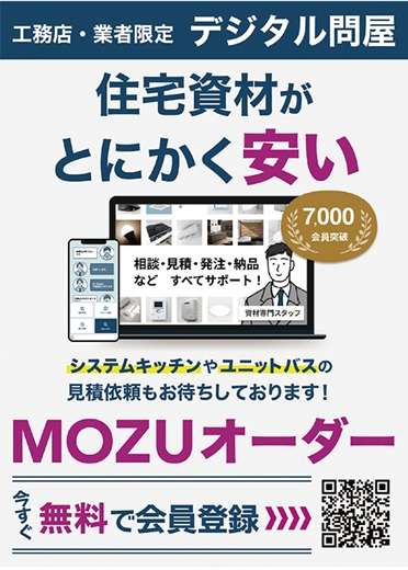 MOZU(東京都港区)が提供する工務店や住宅事業者、職人限定のデジタル問屋「MOZUオーダー」が、サービス開始1年で登録者数7000社を突破した。建築現場で使用されるエアコン、給湯器、壁紙などの資材を集中購買し、さらにWEB上での接客やLINE、チャットを効率的に使うことで、「とにかく安い」住宅資材を実現。会員登録・閲覧は無料。