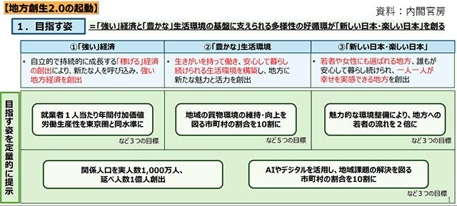 政府は6月13日に開いた閣議で「地方創生2.0基本構想」(PDF)を決定した。目標達成に向けた施策として、①安心して働き暮らせる地方の生活環境の創生、②付加価値創出型の新しい地方経済の創生、③人や企業の地方分散、④新時代のインフラ整備と新技術の徹底活用、⑤都道府県の枠を超えた広域リージョン連携―に取り組む考えを示している。「地方創生2.0」の目指す姿や国・地方公共団体・地域企業などが果たすべき役割、具体的な施策を明記することで、多様なステークホルダーが一体となって地域を支える体制を整える。