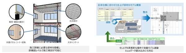 「施工詳細」は、土工・仮設・躯体のもととなる施工詳細情報を一貫して扱うことができる新機能で、設計図書の仕上げ表をもとにワンタッチで仕上げ部材をBIMデータとして配置する。エクセルデータの仕上げ表にも対応する。