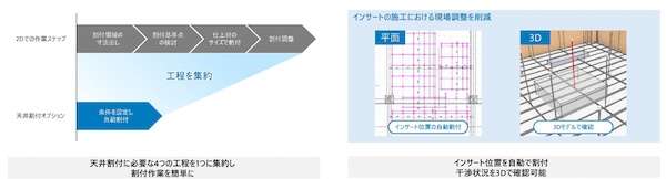 「天井割付」は、割付・吊りボルトの施工検討が可能で、指定した割付パターンを瞬時に3Dモデル化して割付作業を4分の1に短縮する。