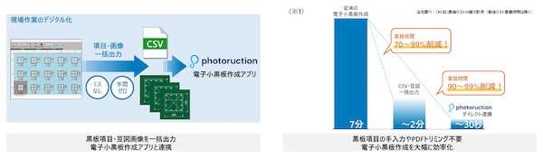 電子小黒板作成を効率化する「黒板作成アシスト」は、躯体リストから小黒板に必要な情報と豆図を整合性の取れた形で出力。その出力データを各社の電子小黒板システムに取り込むことで、作業時間を7割削減できるとする。