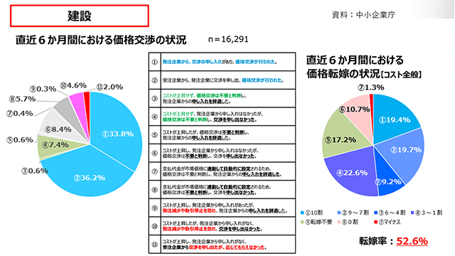 中小企業庁は6月20日、「価格交渉促進月間(2025年3月)」のフォローアップ調査結果(PDF)を公表した。これによると、「建設業」の転嫁率は52.6%で、前回調査から2.3ポイント増加。要素別では「原材料費」53.7%(同2.1ポイント増)、「エネルギー費」(同2.2ポイント増)、「労務費」50.4%(同3ポイント増)となり、価格転嫁が進んでいる。