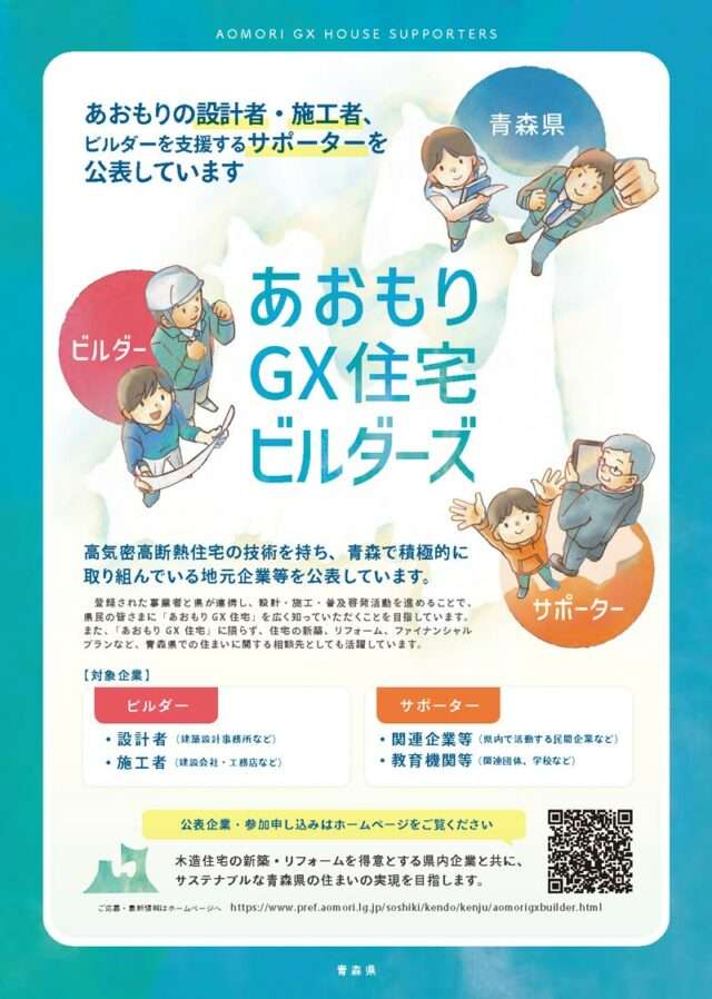 あおもりGX住宅ビルダーズでは、断熱等級5以上・C値2.0㎠/㎡以下の新築住宅を3棟以上設計、施工した実績のある設計者・施工者を「ビルダー」として登録、公表する。また、住宅関連企業や金融機関、教育機関を、ビルダーと連携して支援する「サポーター」と位置付ける。