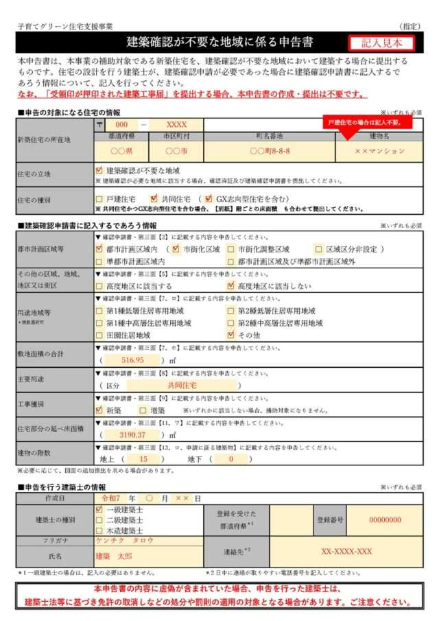 また、新築で建築確認が不要な地域に建築する場合、建築工事届(自治体の受領印あり)を、確認申請書や確認済証の代替として用いることができる。6月30日以降は、建築工事届に加え「建築確認が不要な地域に係る申告書」の提出でも申請を可能にする。