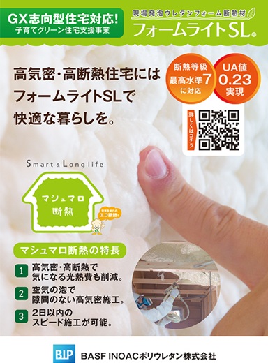 BASF INOACポリウレタン(愛知県新城市)は、現場発泡ウレタンフォーム断熱材「フォームライトSL」を使用し「マシュマロ断熱」を施すことで、断熱等級7に対応し、UA値0.23を実現する高気密・高断熱住宅を提案している。