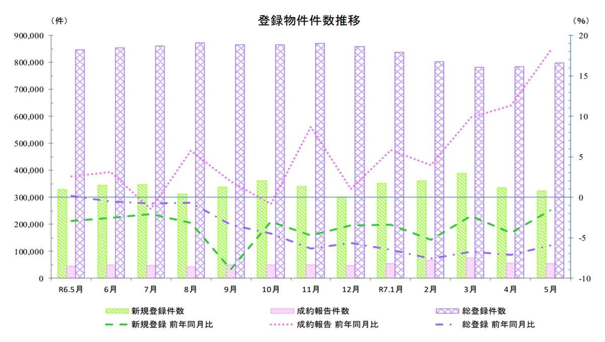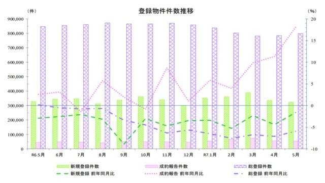 新規登録件数は32万3533件で前年同月比1.6%減の14カ月連続マイナス、前月比は3.2%減の2カ月連続マイナスとなった。成約報告件数は5万3060件で前年同月比18.1%増と7カ月連続でプラスとなり、前月比は5.2%減の2カ月連続マイナス。総登録件数は79万7460件で前年同月比6.0%減の12カ月連続マイナス、前月比は1.6%増と2カ月連続プラスとなった。