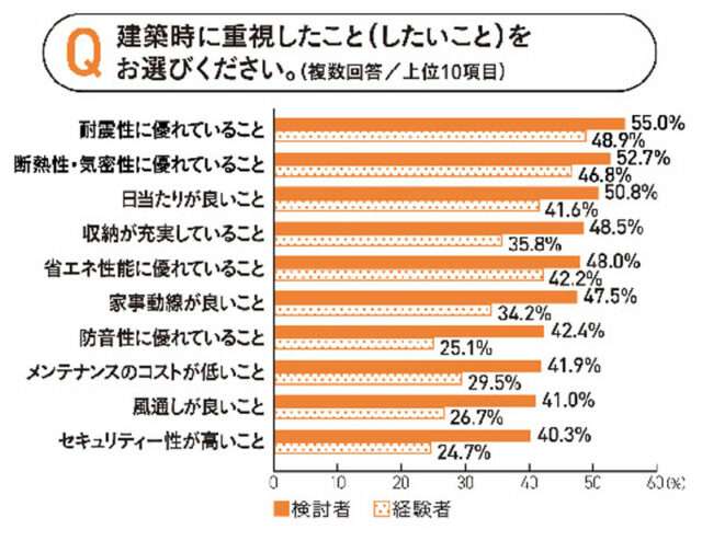 不動産情報サービスのアットホーム(東京都大田区)はこのほど、注文住宅の検討者、および建築経験者に対して行った「注文住宅を建てるまで」実態調査の結果を公表した。検討者、経験者のいずれも、建築時に重視する(した)点では「耐震性に優れていること」(検討者55.0%・経験者48.9%)がトップとなった。また「断熱性・気密性に優れていること」も検討者・経験者のいずれも2位となり、住宅性能への関心の高さがうかがえる。