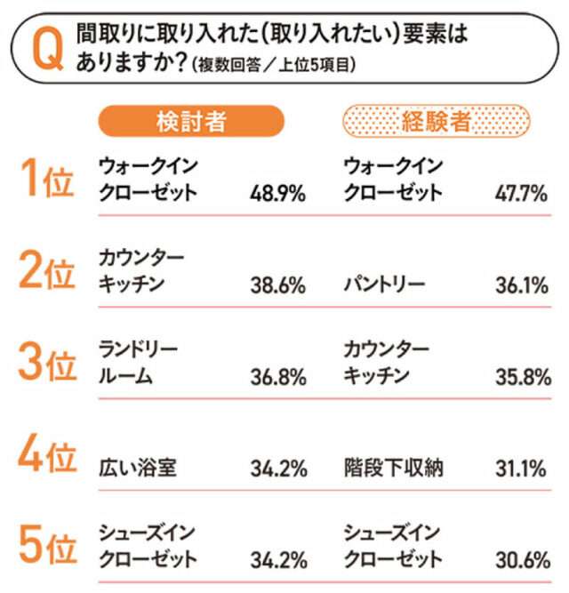 間取りに取り入れたい(取り入れた)要素は、検討者・経験者ともに、「ウォークインクローゼット」が最も多く、50%弱を占めた。