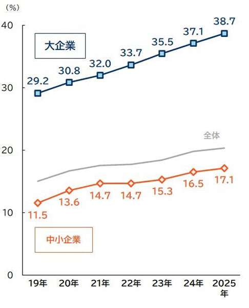 企業規模別に見ると、「大企業」が38.7%(同1.6ポイント増)、「中小企業」は17.1%(同0.6ポイント増)だった。中小企業は上昇したものの伸び率は低く、企業規模による格差は広がっている。