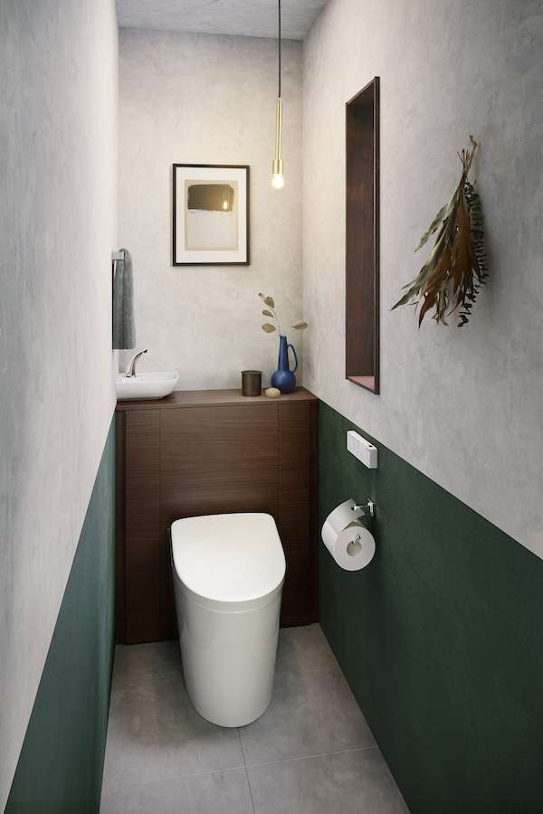 床から浮かせたフローティングデザインの「レストパルF」は、側面の継ぎ目をなくし、滑らかで丸みのあるフォルムに仕上げた。さらに、便器背面のキャビネットに強固な取付スタンドを組み込むことで、工事の負荷を軽減する。