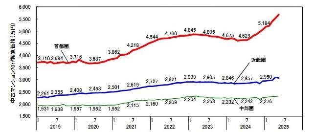 東京都は3.5%増の8599万円と13カ月連続で上昇し、前年同月比の上昇率も拡大。強含みや事例シェア拡大などで首都圏の価格をけん引している。神奈川県は3936万円(1.4%増)、千葉県は2791万円(0.8%増)と堅調に推移する一方、埼玉県は横ばいの2960万円と緩やかな上昇傾向が一服した。