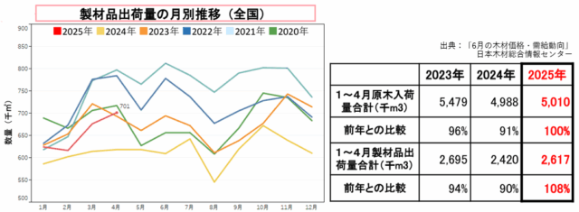 米材は、マツ原木価格が強含みで推移。米マツIS級並の対日輸出価格は前月と同水準で決着した模様。国内の2×4材の価格は、いわゆる「トランプ関税」の影響で4月上旬までは上昇したが、関税が保留されたことで、5月末には年初の価格水準にまで戻っている。原木入荷は3月から2カ月連続で増加したが、国内の製品需要が低調で、プレカット工場の稼働率は伸び悩んでいる。