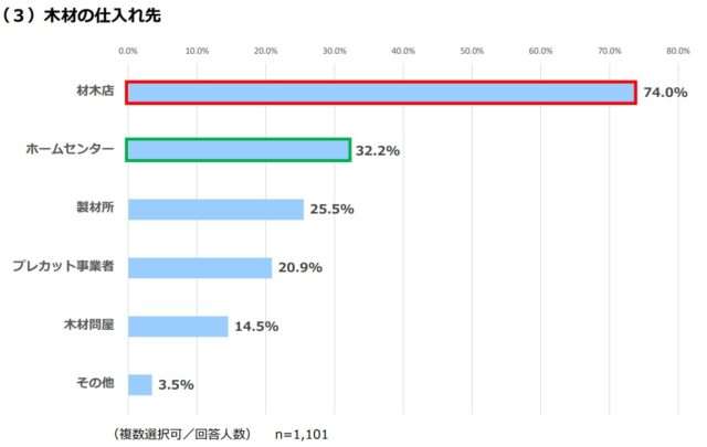 木材の仕入れ先は、材木店が74%と圧倒的に多いが、ホームセンターも32.2%と3人に1人が利用していることがわかった。