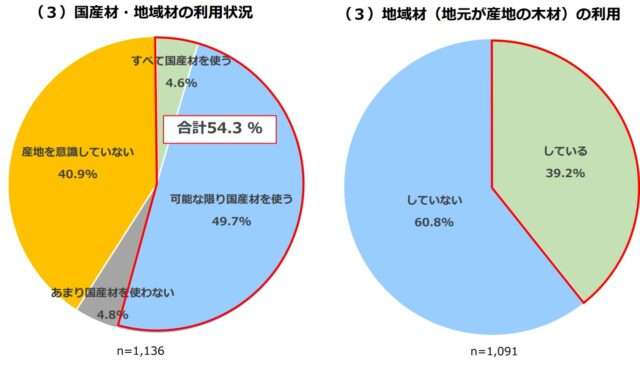 国産材や地域材の利用状況は、すべて国産材を使う(4.6%)、可能な限り国産材を使う(49.7%)をあわせると、国産材・地域材の利用は50%以上となった。地元が産地の地域材の利用も約4割と高い結果となった。