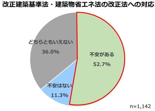 今回のアンケートでは、初めて補助事業などの活用や制度への対応状況についても調査した。それによると、改正建築基準法・建築物省エネ法改正法への対応については、「不安がある」と回答した工務店が52.7%にのぼった。