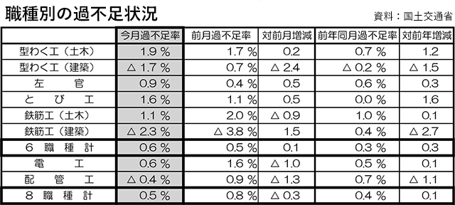 職種別では、「鉄筋工(建築)」(△2.3%)、「型わく工(建築)」(△1.7%)、「配管工」(△0.4%)が過剰となったが、その他の職種では不足となった。「型わく工(建築)」は前月の0.7%の不足から、「配管工」は0.9%の不足から過剰に転じている。「鉄筋工(建築)」は2カ月連続での過剰だが、前月より過剰幅が1.5ポイント縮小した。前月より不足幅が広がったのは、「左官」「とび工」(0.5ポイント増)などだった。