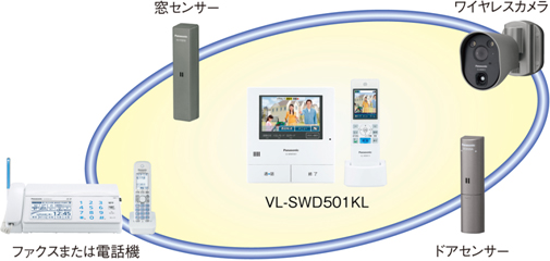 同日に発売される「LEDセンサーライト付き屋外ワイヤレスカメラ」やファクス、電話機、窓センサーやドアセンサーと接続すれば、ホームセーフティをさらに強化できる。