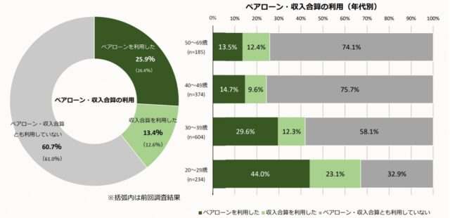 ペアローンまたは収入合算の利用については、39.3%が「ペアローン」または「収入合算」を利用。若い世代で利用割合が高くなっている。 20代では7割近くが「ペアローン」または「収入合算」を利用している。
