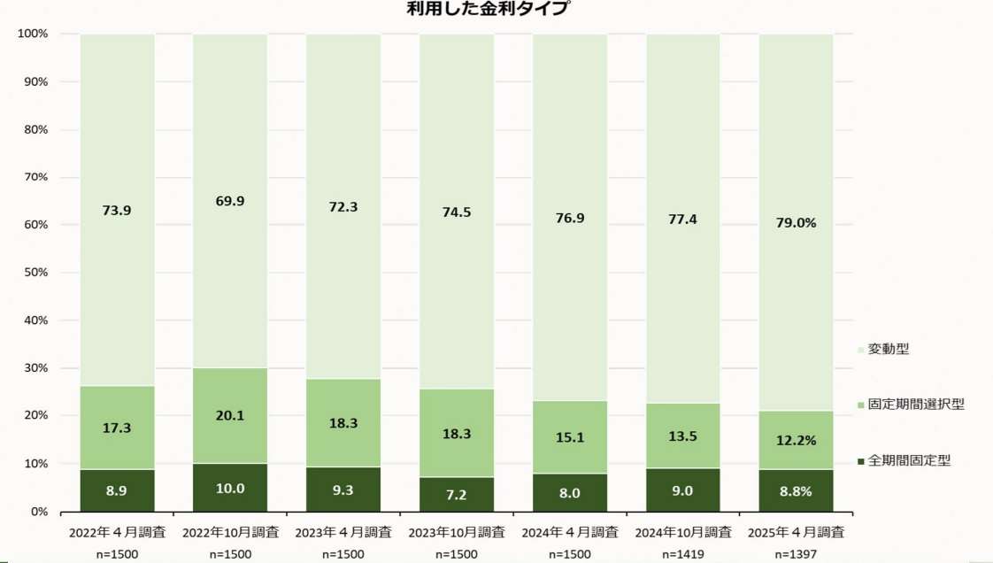 それによると、利用した住宅ローンの金利タイプは、「変動型」が79.0%と最も多く、前回(昨年10月)調査よりも1.6ポイント増加した。「固定期間選択型」は12.2%、「全期間固定型」は8.8%で、それぞれ前回調査よりも「固定期間選択型」が1.3ポイント、「全期間固定型」が0.2ポイント減少した。