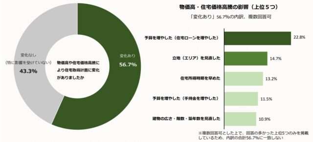 物価高・住宅価格高騰の影響については、足下の物価上昇や住宅価格高騰で住宅取得計画に変化があったと回答した人は56.7%と6割近くに上った。内容としては、「予算を増やした(住宅ローンを増やした)」が最も多く、次に「立地(エリア)を見直した」、「住宅取得時期を早めた」などが続いた。
