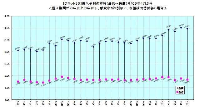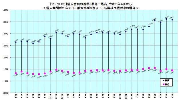返済期間20年以下の「フラット20」の最低金利は、融資率9割以下が1.45%、9割超が1.56%で、前月から0.05ポイント下がり、2カ月ぶりに下降。最高金利は、9割以下が3.58%、9割超が3.69%と、いずれも0.04ポイント下降した。