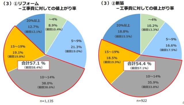 リフォームと新築で、工事費に対しての値上がり率を聞いたところ、前回同様にリフォーム、新築ともに10~19%の値上がり率が多いことがわかった。
