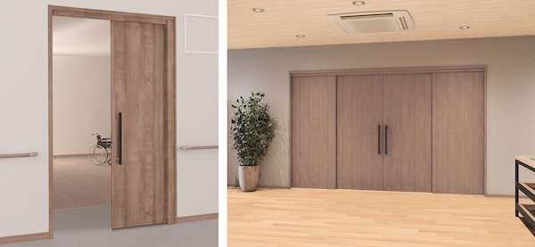 最大有効開口幅3000mm(従来は2400mm)を実現する4枚引分吊戸を追加。扉は片側連動式のため、通常の吊戸引分よりも壁の開口幅を小さくすることができる。