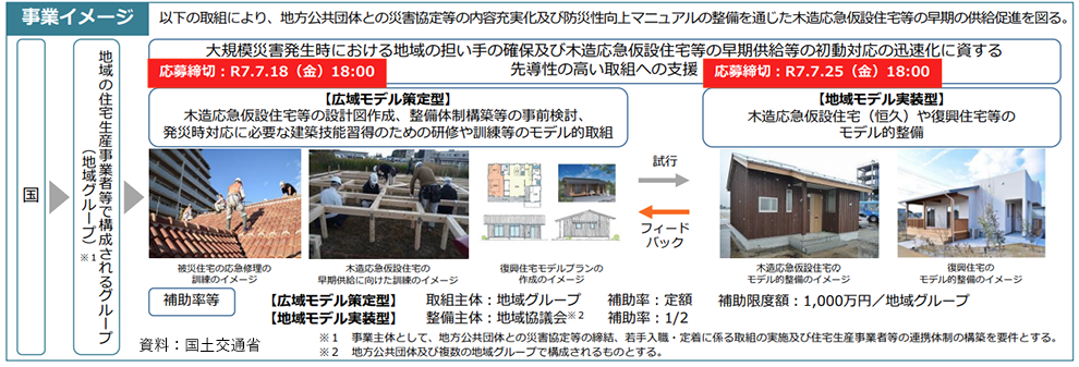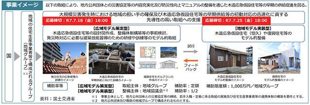 同事業では、地域工務店グループによる木造応急仮設住宅などのモデル住宅の整備や大規模災害発生時の初動対応、災害時に活動する地域工務店の担い手確保などの取組に対して支援を行う。