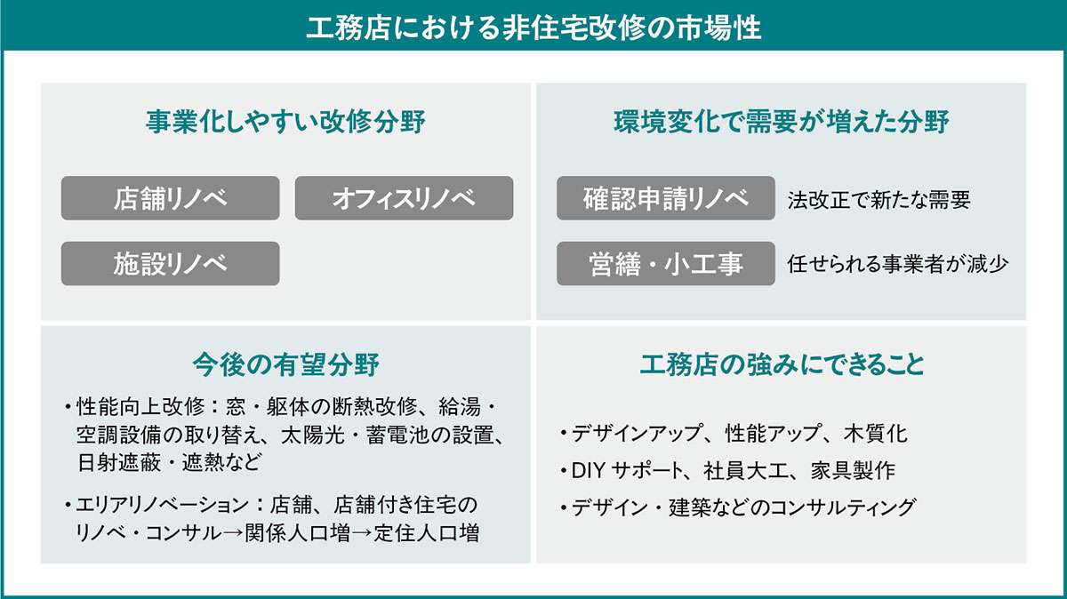 非住宅改修で工務店が事業化しやすいのは店舗リノベ、オフィスリノベ、宿泊施設・高齢者施設・福祉施設などの施設リノベだ。デザインアップ、性能アップ、木質化、DIYサポート、社員大工などの強みを生かした改修提案が基本となる。