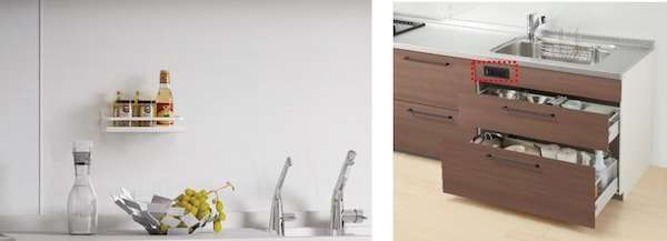 キッチンパネルに、マグネット収納が取り付けられ、汚れもふき取りやすい「マグネット対応パネル」と、調理家電が手元で手軽に使用できる「コンセント付き2段引き出し」を新たに設定。