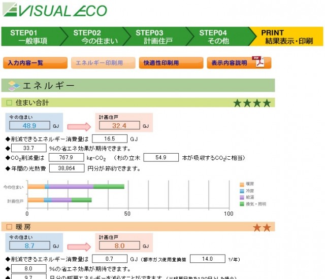 ツールは、住まい手が要望する計画中の住宅について地域区分、建物方位、Q値(7区分)μ値(3区分)、パッシブ要件、暖冷房・給湯方式、通風・節湯等の有無などをその場で入力するだけで、その住宅の「室内温度」、「体感温度」、「年間エネルギー消費量」をグラフ化したプレゼンシートが作成できる。現在の戸建てやマンションの住まいとの比較した表示もできる。