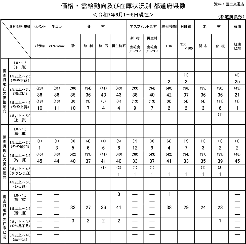 同調査は、建設資材の需給および価格の安定化、建設事業の円滑な実施を図る目的で実施。建設資材の供給側(生産者、商社、問屋、販売店、特約店)と需要側(建設業者)からモニターを選定し、主要建設資材(生コンクリート、鋼材、木材など7資材13品目)の需給・価格・在庫の変動状況を把握している。