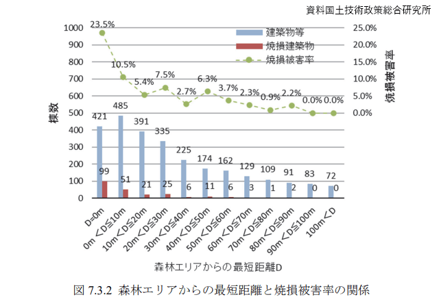 また、森林エリア内にあった建物の焼損被害率は23.5%と高かったが、森林エリアから離れるほど焼損被害率が低下する傾向が見られ、森林との距離が90mを超えると0%となった。その一方で、林野から離れた場所にある建物への延焼の確認されていることから、林野から飛び火が発生した可能性もあると分析している。