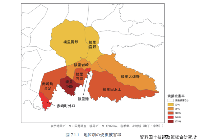 衛星画像の判読および現地調査により推計した焼損率は7.5%。地区別では、「綾里小路地区」(75.0%)、「赤崎町外口」(31.7%)、「綾里港地区」(26.4%)、「赤崎町合足」(15.2%)などで高く、被災地域の中でも南西部の被害が大きかった。