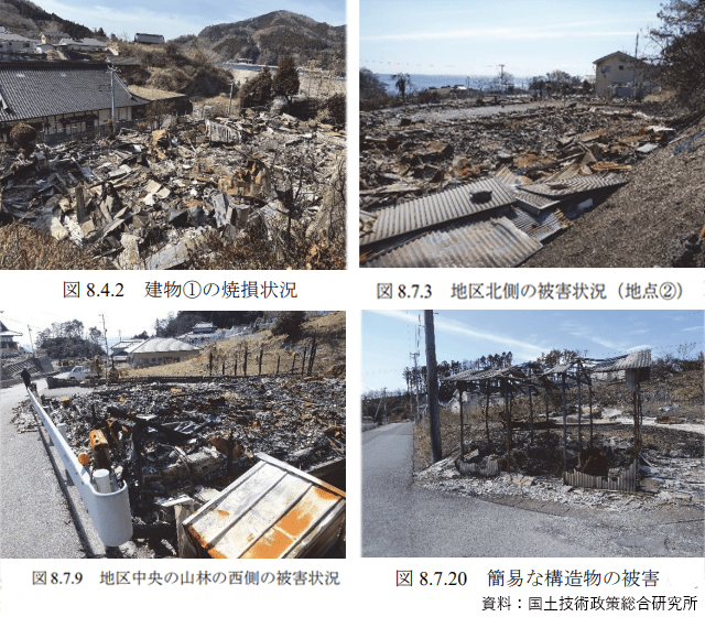 被災した建物の多くは普通建物・普通無壁舎で、延焼被害のあった住宅では、住宅以外の納屋・倉庫・物置、建物周囲に置かれた漁具などの可燃物から延焼した可能性が指摘されている。