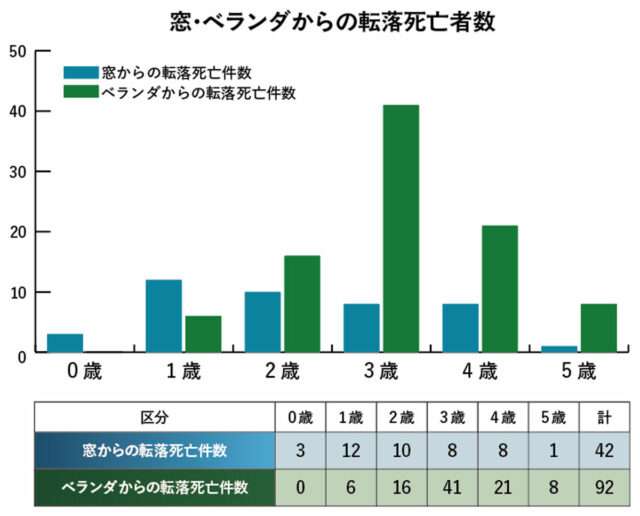 1993~2024年に発生した転落による子どもの転落死亡事故134件中、42件は窓から、92件はベランダからの転落だった。窓からの転落事故の場合、1歳が12件で最多。0歳児の事故も3件あった。年齢を重ねるごとに件数は減少している。一方、ベランダからの転落事故は1歳の6件、2歳の16件と増加し、3歳の41件がピーク。それ以降は減少するものの、4歳児でも21件の事故が起きている。
