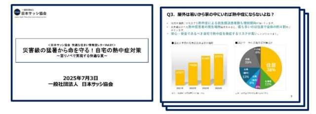 日本サッシ協会(東京都港区)はこのほど、協会内に設置した「快適な住まい情報室」のレポート第1弾として、「災害級の猛暑から命を守る!自宅の熱中症対策 ~窓リノベで実現する快適な夏~」を公開した。レポートでは、記録的猛暑や熱中症搬送の実態を解説しながら、快適な住まいを実現するための窓リノベーションがもたらす多角的な便益について、Q&A形式で詳しく紹介している。
