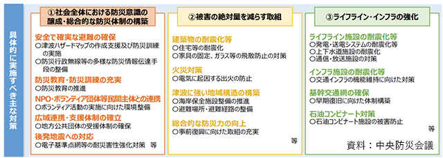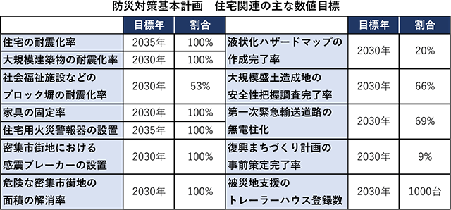 大規模地震時でも倒壊しないための耐震性の確保については、住宅は2035年までに、不特定多数が利用する大規模建築物では2030年までに、それぞれおおむね100%の達成を目指す。他に、住宅用火災警報器の設置を2035年までに、著しく危険な密集市街地における感震ブレーカーの設置を2030年までに完了させる計画を打ち出した。