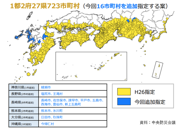 3月に公表された被害想定では、太平洋側を中心に震度6弱以上または津波高が3mとなる市町村が、31都府県の764市町村に上ると想定。これに伴って著しい地震災害が生じるおそれがある防災対策推進地域として、神奈川県綾瀬市、長野県塩尻市・王滝村、長崎県長崎市・佐世保市・諫早市・平戸市・五島市・西海市・雲仙市・新上五島町、熊本県熊本市・氷川町、大分県日田市・玖珠町、沖縄県今帰仁村を追加した。