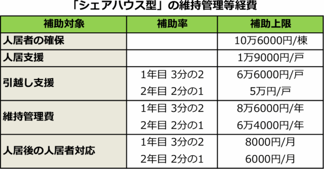 補助額は、①単年度型は補助率が3分の2、上限額は1棟当たり250万円。耐震改修工事を行う場合は1棟当たり200万円を上限に上乗せする。②複数年度型では改修費用(①と同額)に加えて、空き家の掘り起こし費用を毎年最大500万円支給。補助率は、1年目は4分の3、2~3年目は3分の2、4~5年目は2分の1となっている。③シェアハウス型では改修費(①②と同額)に加えて、入居者の確保や引越しのための費用、維持管理費などについても支援を行う。