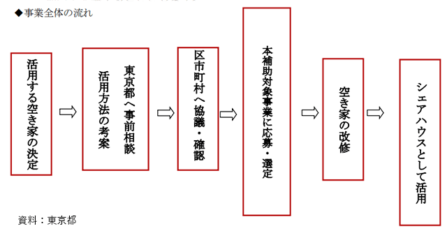 いずれの事業も空き家のある区市町村が策定する都市計画法に基づいて事業を実施するため、空き家の活用方法を検討する時点で、まずは都に事前相談し、その後区市町村とも協議を行う必要がある。