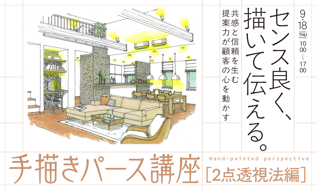 お客さまとの打ち合わせ時のコミュニケーションに役立つ手描きパースの技術を学びます。この講座では2点透視法を習得し、空間に奥行きと広がりのある、より立体的な表現ができるようになることを目指します。