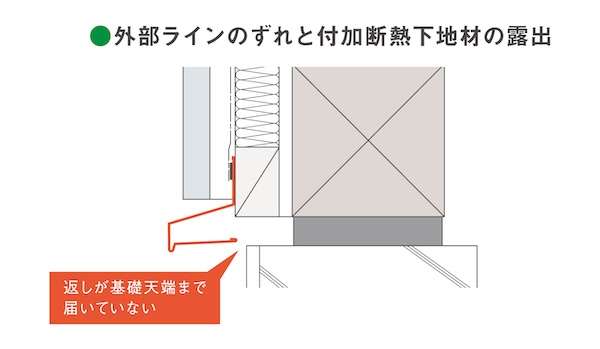 ただし、付加断熱をすると、特に床断熱や基礎内断熱の場合、基礎の外部ラインと壁の外部ラインにズレが生じ、Z型の土台水切りや立ち上がりと同面までしか返しがない水切りを使用した場合、付加断熱の下地材が露出してしまう。