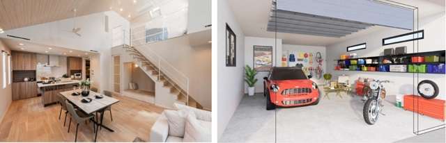 「大空間」採用後のLDK(左)とアクティブガレージのイメージ
